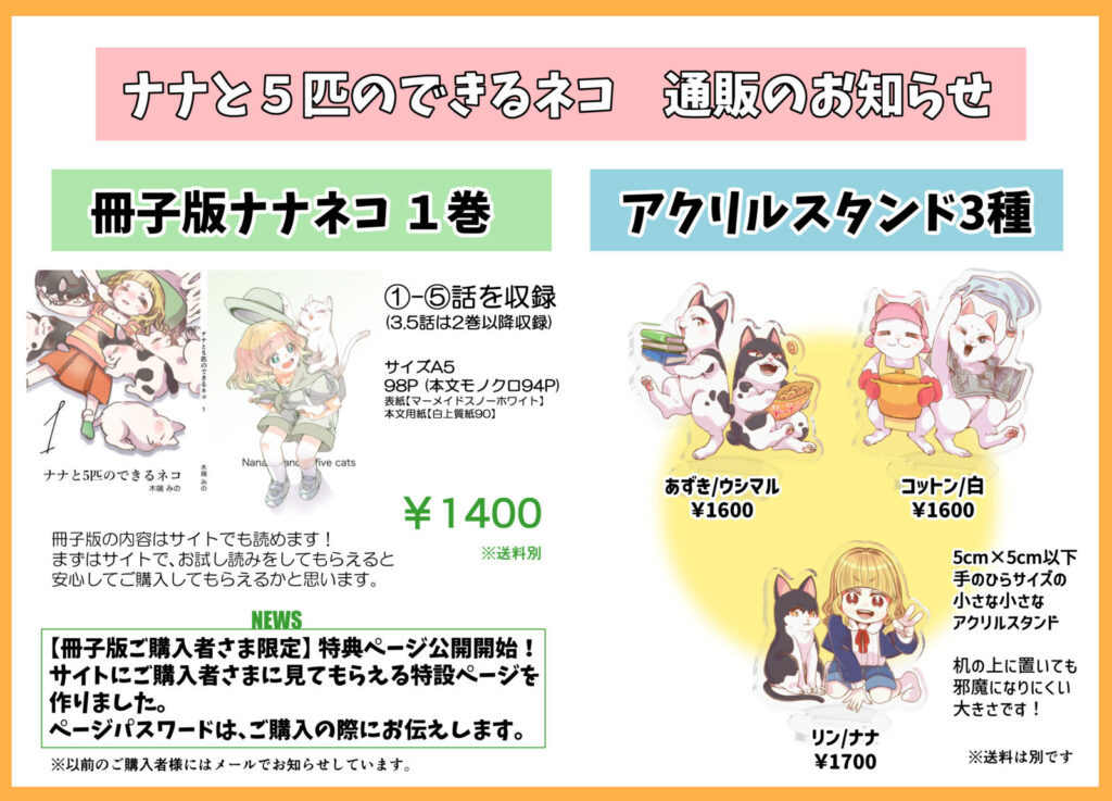 このサイトで更新している『ナナと5匹のできるネコ』の冊子やグッズも販売開始しています。